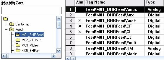 充分發(fā)揮RSView32軟件的標(biāo)簽占位符(Tag Placeholders)和參數(shù)(Parameters)功能,兩者完美的配合,用最少的畫面達(dá)到更多的監(jiān)控功能,讓程序設(shè)計者大大降低了勞動強度,達(dá)到了事半功倍的效果。由于GCL生產(chǎn)線中大量使用了電動機(jī),并且每臺電動機(jī)的操作(包括手動、自動選擇;開、停機(jī)選擇;正、反轉(zhuǎn)向選擇;復(fù)位和確認(rèn)等)和顯示(包括故障報警、電動機(jī)實時電流、狀態(tài))功能基本相同(見圖5)。因此,為了更方便組態(tài)和程序的管理,我們依舊采用和PLC編程相似的處理方法,將各種標(biāo)簽(tags)分門別類,根據(jù)生產(chǎn)工藝自定義一些文件夾和變量名。這樣,我們只需要做一個畫面,來監(jiān)控不同電動機(jī)。