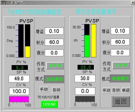 圖9中,以Td101/Td102脫硅槽內(nèi)礦漿溫度為主調(diào)節(jié)回路,以進(jìn)入Td101/Td102脫硅槽脫硅蒸汽流量為副調(diào)節(jié)回路,構(gòu)成串級(jí)調(diào)節(jié)回路,通過(guò)調(diào)節(jié)13FCV104調(diào)節(jié)閥,控制進(jìn)入Td101/Td102脫硅槽脫硅蒸汽流量。其中“13TE105/107選擇”按鈕是主回路的溫度測(cè)量值,用來(lái)選擇Td101脫硅槽漿液溫度13TE105或選擇Td102脫硅槽漿液溫度13TE107。