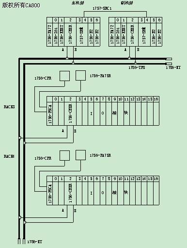 圖2中1756-CNBR是ControlNet通信模塊,它有兩個(gè)冗余的網(wǎng)絡(luò)通道:A口和B口,使控制信息實(shí)現(xiàn)冗余。傳送速率達(dá)5Mbps,傳送介質(zhì)是75Ω阻抗的1786-RG6同軸電纜,通過(guò)BNC連接器與ControlNet總線相連。
