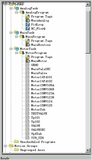 溶出車間由數(shù)十條單回路或串級(jí)調(diào)節(jié)回路組成,用來(lái)完成礦漿進(jìn)料流量、料位、溫度及密度調(diào)節(jié),生產(chǎn)工藝對(duì)實(shí)時(shí)性有嚴(yán)格的要求。利用RSLogix5000的多任務(wù)編程方式,將控制程序安排在三個(gè)任務(wù)中去完成,即主任務(wù)、模擬量控制任務(wù)和馬達(dá)控制任務(wù)(圖5)。
