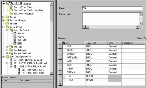 溶出車間需要對(duì)100多臺(tái)電動(dòng)機(jī)、變頻器和各種閥門進(jìn)行實(shí)時(shí)控制,其數(shù)據(jù)的組織和管理是一個(gè)十分繁重的任務(wù)。我們利用RSLogix5000可以自定義數(shù)據(jù)結(jié)構(gòu)的功能,按照工藝要求自定義四種數(shù)據(jù)結(jié)構(gòu):電動(dòng)機(jī)、普通閥、調(diào)節(jié)閥、變頻器(圖6),不但大大縮短了創(chuàng)建數(shù)據(jù)結(jié)構(gòu)的時(shí)間,而且提高了程序的可靠性和可讀性。圖6右邊窗口顯示了變頻器數(shù)據(jù)結(jié)構(gòu)VPF。