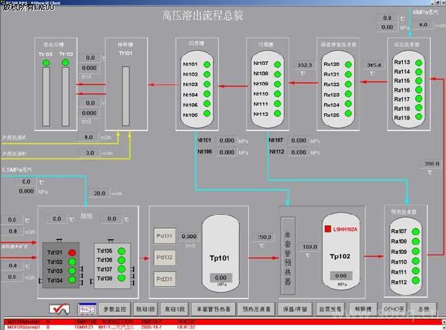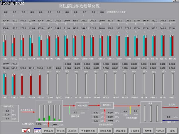 該畫面顯示了高壓溶出的主要工藝流程及參數(shù),操作員可以通過(guò)該畫面對(duì)主要參數(shù)進(jìn)行監(jiān)控。