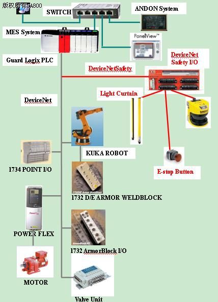 摘 要:在當(dāng)今的工業(yè)自動(dòng)化領(lǐng)域,基于現(xiàn)場(chǎng)總線技術(shù)的網(wǎng)絡(luò)集成自動(dòng)化已經(jīng)取代原有的集散控制系統(tǒng)(DCS),成為這一領(lǐng)域的技術(shù)熱點(diǎn)。而控制網(wǎng)/設(shè)備網(wǎng)現(xiàn)場(chǎng)總線技術(shù)將會(huì)成為未來(lái)發(fā)展應(yīng)用最DeviceNet 安全PLC 現(xiàn)場(chǎng)總線廣的三大現(xiàn)場(chǎng)總線技術(shù)之一。該文首先詳細(xì)分析了Rockwell Automation具有三層網(wǎng)絡(luò)平臺(tái)的全分布式控制系統(tǒng)的工作原理和技術(shù)規(guī)范,闡述了系統(tǒng)結(jié)構(gòu)及其強(qiáng)大的功能,展示了Rockwell Automation網(wǎng)絡(luò)對(duì)工業(yè)過(guò)程的控制方式和控制特點(diǎn)。機(jī)器人汽車焊裝線控制系統(tǒng)通過(guò)EtherNet/IP實(shí)現(xiàn)車間車間設(shè)備信息的監(jiān)控,生產(chǎn)管理系統(tǒng)(MES)的實(shí)施,生產(chǎn)報(bào)表的管理,通過(guò)以DeviceNet為底層網(wǎng)絡(luò)的現(xiàn)場(chǎng)總線實(shí)現(xiàn)設(shè)備控制,主控PLC系統(tǒng)采用GUARD LOGIX控制器,集成了安全PLC的控制功能,主線上所有機(jī)械設(shè)備、機(jī)器人的控制通過(guò)DEVICENET總線完成,安全信號(hào)如急停按鈕、安全光柵、安全掃描雷達(dá)、安全門開(kāi)關(guān)通過(guò)DEVICENET SAFETY總線完成控制。