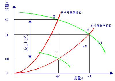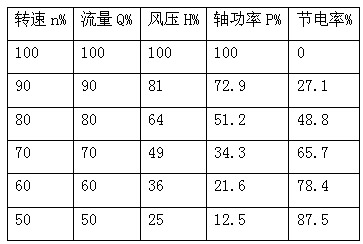 ![]() 圖3-1 風(fēng)機(jī)的運(yùn)行曲線 當(dāng)所需風(fēng)量從Q1減小到Q2時(shí),如果采用調(diào)節(jié)風(fēng)門(mén)的辦法,管網(wǎng)阻力將會(huì)增加,管網(wǎng)特性曲線上移,系統(tǒng)的運(yùn)行工況點(diǎn)從A點(diǎn)變到新的運(yùn)行工況點(diǎn)B點(diǎn)運(yùn)行,所需軸功率P2與面積H2×Q2成正比;如果采用調(diào)速控制方式,風(fēng)機(jī)轉(zhuǎn)速由n1下降到n2,其管網(wǎng)特性并不發(fā)生改變,但風(fēng)機(jī)的特性曲線將下移,因此其運(yùn)行工況點(diǎn)由A點(diǎn)移至C點(diǎn)。此時(shí)所需軸功率P3與面積HB×Q2成正比。從理論上分析,所節(jié)約的軸功率Delt(P)與(H2-HB)×(C-B)的面積成正比。 考慮減速后效率下降和調(diào)速裝置的附加損耗,通過(guò)實(shí)踐的統(tǒng)計(jì),風(fēng)機(jī)類通過(guò)調(diào)速控制可節(jié)能達(dá)20%~50%。 2.2變頻改造節(jié)能分析 改造前工頻運(yùn)行功率計(jì)算公式 其中: U——電機(jī)電壓,kV; I——電機(jī)電流,A; P1——單一負(fù)荷下工頻運(yùn)行功率, kW; 其中: T——全年平均運(yùn)行時(shí)間,h; P1——單一負(fù)荷下的運(yùn)行功率,kW; δ——這種負(fù)荷下的全年運(yùn)行時(shí)間比例; C1——改造前總耗電量,kW·h。 改造后變頻運(yùn)行預(yù)計(jì)功率計(jì)算公式: 利用公式: 其中: P1——工頻運(yùn)行功率,KW; P額——額定軸功率,KW; 根據(jù)改造風(fēng)量不變的原則,有Q1-Q2,其中Q2為改造后的風(fēng)量。所以 其中C2——改造后總耗電量,kW·h。 2.3節(jié)能對(duì)照表:風(fēng)機(jī)、水泵變頻調(diào)速時(shí)的能耗比較