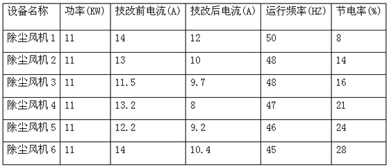 ![]() 上述均為百分比,100%流量為風(fēng)機(jī)的額定流量,100%功率為工頻額定工況運(yùn)行時(shí)消耗功率(即電機(jī)輸入功率 = 風(fēng)機(jī)額定軸功率/電機(jī)效率,電機(jī)效率一般為93-96%,額定功率較大者效率較高)。變頻調(diào)速時(shí)的節(jié)能量即為兩種調(diào)節(jié)方式的能耗差值(百分比乘額定消耗功率)。 2.4 破碎除塵風(fēng)機(jī)技改前后能耗對(duì)照表