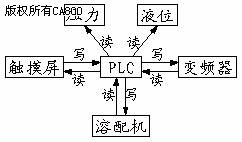 本系統(tǒng)對溶配機(jī)采用了PLC直接控制,這樣既減少了電氣元器件又簡化線路,同時(shí)還通過觸摸屏把相關(guān)的過程變量準(zhǔn)確及時(shí)地顯示出來,供值班人員作參考之用。為了能夠準(zhǔn)確地控制投加量,采用變頻器控制螺桿泵來實(shí)現(xiàn)投加量的線性可調(diào),同時(shí)對頻率的設(shè)置及一些相關(guān)量的控制就是通過觸摸屏在現(xiàn)場來實(shí)現(xiàn)。系統(tǒng)的部分網(wǎng)絡(luò)結(jié)構(gòu)如圖2。