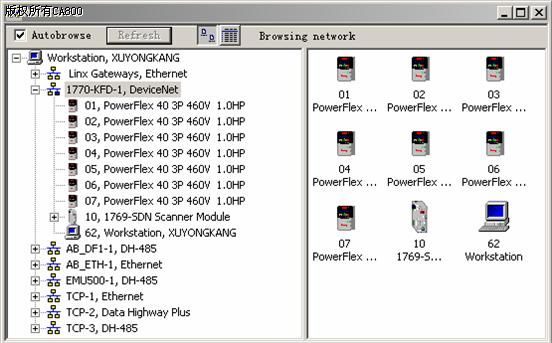 (1)配置計(jì)算機(jī)接入DeviceNet網(wǎng)絡(luò)。硬件使用1770-KFD,軟件使用RSLinx。當(dāng)計(jì)算機(jī)通過串口與1770-KFD的RS232接口連接好后,則軟件的配置過程如下:啟動(dòng)RSLinx,點(diǎn)擊“Communications”——“Configure Drivers”,則會出現(xiàn)“Configure Drivers”的對話框,在上方的下拉表里選擇“DeviceNet Drivers (1784 PCD/PCIDS,1770-KFD….)”此項(xiàng),接著在出現(xiàn)的驅(qū)動(dòng)選擇對話框中選擇“Allen-Bradley 1770-KFD”,然后再簡單地設(shè)置一下就行了。又當(dāng)1770-KFD的DeviceNet接口接到DeviceNet網(wǎng)時(shí),在Rslinx就會出現(xiàn)類似本系統(tǒng)的畫面(如圖4)。