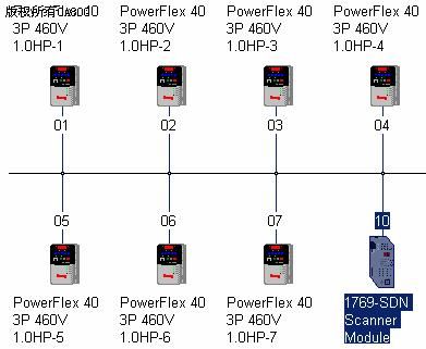 變頻器選用A-B PowerFlex變頻器家族中尺寸最小并且效率最高的PowerFlex40交流變頻器。PowerFlex40具有強(qiáng)大的通訊功能,只要配置不同的通訊卡就可以能組成DeviceNet、EtherNet/IP、Profibus網(wǎng)絡(luò),本系統(tǒng)就是選用22-COMM-D通訊卡來組成DeviceNet網(wǎng)絡(luò)。同時(shí),因?yàn)镻LC選用的是MicroLogix 1500,所以在通訊模塊上選用DeviceNet掃描模塊1769-SDN來配置DeviceNet網(wǎng)絡(luò)。