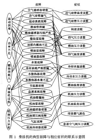 在柴油機(jī)運(yùn)行過程中,可能出現(xiàn)“起動(dòng)困難”、“功率不足”、“燃油消耗大”等典型故障。作為診斷柴油機(jī)的前提,運(yùn)行狀態(tài)參數(shù)的取值是連續(xù)的,這些參數(shù)對(duì)規(guī)則結(jié)論(故障狀態(tài))的影響程度沒有一個(gè)明顯的界限。為保證柴油機(jī)參數(shù)監(jiān)測(cè)與診斷的合理性和指導(dǎo)的可靠性,必須對(duì)這種動(dòng)態(tài)特性及其測(cè)量的不確定性進(jìn)行合理考察和描述。在廣泛搜集和聽取柴油機(jī)領(lǐng)域?qū)<医?jīng)驗(yàn)的基礎(chǔ)上,結(jié)合柴油機(jī)的理論知識(shí)與運(yùn)行環(huán)境的實(shí)際情況,得到圖1所示的柴油機(jī)典型故障與相應(yīng)癥狀的聯(lián)系。