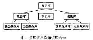 知識(shí)庫采用多庫結(jié)構(gòu)的組織模式,包括數(shù)據(jù)庫、事實(shí)庫和規(guī)則庫。這樣可以提高系統(tǒng)工作效率,也便于知識(shí)的搜索。各庫之間相互獨(dú)立,一個(gè)庫的修改不會(huì)影響其它庫。知識(shí)庫的結(jié)構(gòu)如圖2所示。