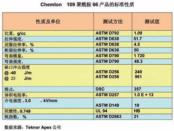 據(jù)介紹,Chemlon 109材料已達(dá)到了克萊斯勒、福特和通用汽車的車用材料標(biāo)準(zhǔn),并已被用于生產(chǎn)這三大汽車公司使用的零部件。