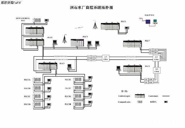 根據(jù)水廠生產(chǎn)工藝及設(shè)計(jì)要求,共有6個(gè)主PLC控制站,9個(gè)子PLC站構(gòu)成控制系統(tǒng),全部采用了羅克韋爾自動(dòng)化的系列PLC,通過(guò)CONTROLNET與中控室進(jìn)行通訊。