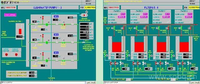 各站點(diǎn)計(jì)算機(jī)顯示的畫(huà)面有水廠工藝流程總圖、各PLC控制流程分畫(huà)面、高壓配電監(jiān)控畫(huà)面、設(shè)備操作畫(huà)面、曲線(xiàn)圖、調(diào)用菜單畫(huà)面、報(bào)警畫(huà)面、報(bào)表畫(huà)面。工作通過(guò)調(diào)用這些畫(huà)面可以全面地了解水廠的運(yùn)行情況,并且很方便地對(duì)設(shè)備操作。