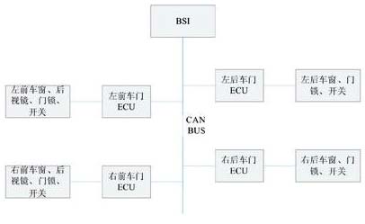 車門控制系統(tǒng)采用總線式拓補(bǔ)結(jié)構(gòu),總線一般采用低速CAN總線或LIN總線,采用不同總線協(xié)議和不同的拓補(bǔ)結(jié)構(gòu)可以提供不同程度的智能。第一種方案是每個車門采用一個集中控制的CAN節(jié)點(diǎn),BSI和四個車門通過一個CAN網(wǎng)絡(luò)連接,如圖1所示。