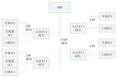第二種方案是每個車門采用分布式LIN網(wǎng)結(jié)構(gòu),將各個功能做成單獨(dú)的節(jié)點(diǎn),即單獨(dú)的后視鏡控制節(jié)點(diǎn),車窗控制節(jié)點(diǎn),門鎖控制節(jié)點(diǎn),開關(guān)輸入控制節(jié)點(diǎn),該開關(guān)輸入控制節(jié)點(diǎn)可以同時作為LIN的主節(jié)點(diǎn),每個車門的主節(jié)點(diǎn)同時為CAN-LIN網(wǎng)關(guān)節(jié)點(diǎn),BSI和四個車門通過CAN網(wǎng)連接。如圖2所示。