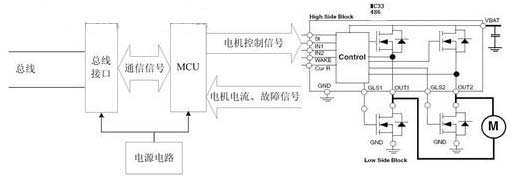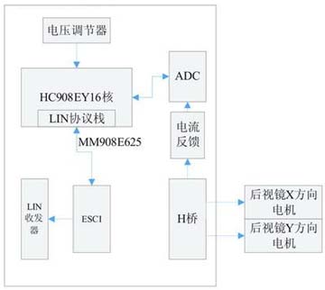 后視鏡節(jié)點(diǎn)方案如下圖所示,實(shí)現(xiàn)對后視鏡上下、前后兩個方向的位置調(diào)整,實(shí)現(xiàn)折疊功能和加熱功能,采用飛思卡爾的智能分布式控制單芯片MM908E625實(shí)現(xiàn),MM908E625是一個高度集成的單封裝解決方案,在一個SOIC54的封裝內(nèi)集成了HC08內(nèi)核和SmartMOS模擬控制IC,該模擬控制IC包括LIN物理層收發(fā)器,電壓調(diào)整器,4個半H橋和一個高端開關(guān),采用半H橋?qū)崿F(xiàn)對后視鏡電機(jī)的驅(qū)動從而實(shí)現(xiàn)位置調(diào)整和折疊,利用高端開關(guān)實(shí)現(xiàn)后視鏡加熱。