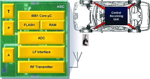 除了胎壓之外,傳感器還可測量輪胎溫度和傳感模塊的電池電壓。加速傳感器可監(jiān)控系統(tǒng)并報(bào)告車輛行駛情況。這對于將系統(tǒng)從節(jié)能狀態(tài)重新激活非常重要。對于這種應(yīng)用而言,電池要能持續(xù)使用超過10年時間。由中央接收單元扮演接收器的角色,該裝置除了接收TPMS信號之外,還可接收和處理來自遙控?zé)o鑰匙門禁(RKE)的信號。