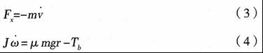 單輪制動時的受力分析如圖4所示,簡化分析忽略滾動摩擦阻力及空氣阻力,其運動微分方程如下: