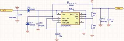 系統(tǒng)供電電路如圖2所示,DC/DC轉(zhuǎn)換芯片采用MC34063,該芯片具有集成基準(zhǔn)電壓、振蕩器同步和輸入電壓范圍寬等特點(diǎn),其輸出電壓可表示為Vout=1.25(1+R39/R40),輸出電流可達(dá)500mA,完全滿足本系統(tǒng)的功耗要求。為了降低干擾,芯片的輸入端和輸出端加了電容C10、C12、C13進(jìn)行濾波處理。