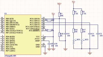 如圖3所示,電壓、溫度檢測采用單片機(jī)內(nèi)部專用ADC采樣通道,不增加額外芯片有利于降低系統(tǒng)成本。ADC基準(zhǔn)電壓等同單片機(jī)工作電壓5V,系統(tǒng)輸入電壓經(jīng)R3、R8分壓簡單濾波后送入PC0(ADC0),此端口根據(jù)分壓比連續(xù)采樣21次,然后將每次所得值相加即可還原系統(tǒng)輸入電壓;RT1、RT2為負(fù)溫度系數(shù)傳感器,當(dāng)溫度上升或下降時(shí)其阻值隨之減小或增大,相應(yīng)ADC端口將多次采樣的電壓值進(jìn)行數(shù)值平均濾波并與已知的電壓/溫度區(qū)間比較,得出實(shí)時(shí)溫度。