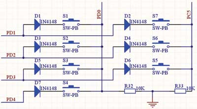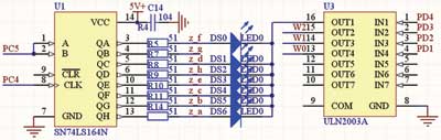 如圖4所示,由于單片機(jī)I/O口有限,鍵盤和顯示電路采用了端口復(fù)用,3位8段LED數(shù)碼管驅(qū)動(dòng)增加了SN74164串入并出芯片進(jìn)一步緩解端口有限的壓力。其中鍵盤有7個(gè)按鍵, 分別為開關(guān)機(jī)、制冷/通風(fēng)、強(qiáng)制冷、設(shè)定、上增、下減,可以進(jìn)行溫度設(shè)置和新風(fēng)時(shí)間設(shè)置等。LED數(shù)碼管可以顯示當(dāng)前車內(nèi)溫度、系統(tǒng)預(yù)設(shè)溫度、輸入電壓等,當(dāng)蜂鳴器報(bào)警時(shí)能顯示故障代碼為維修調(diào)試提供了方便。