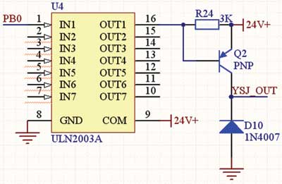 風(fēng)機(jī)、壓縮機(jī)輸出控制電路如圖5所示,單片機(jī)輸出控制信號(hào)經(jīng)ULA2003反向后驅(qū)動(dòng)晶體管Q2,Q2的集電極再連接壓縮機(jī)的起停開關(guān)繼電器的控制輸入端,當(dāng)繼電器由閉合轉(zhuǎn)為斷開時(shí),二極管D10為繼電器線圈續(xù)流。為有效的控制晶體管的導(dǎo)通和關(guān)閉,系統(tǒng)增加了高輸入電壓、高灌電流的ULN2003A驅(qū)動(dòng)芯片。其內(nèi)部采用達(dá)林頓輸入電壓最高達(dá)50V, 灌電流最大500mA。
