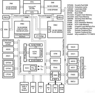 Ingineon公司的TC1796產(chǎn)品即為此類系統(tǒng)級芯片實現(xiàn)的一個很好的例子。32位的TriCore中央處理器(CPU)擁有代碼和數(shù)據(jù)分別獨立的總線,并且通過LFI與系統(tǒng)總線橋接起來,建立起一個與外設(shè)子系統(tǒng)相連的數(shù)據(jù)通道。此外,還有一個通過直接存儲器存取(DMA)與遠端外設(shè)總線相連的通道。