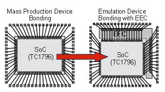 多總線及多內(nèi)核存儲器的復(fù)雜性意味著,只有一個外綁器件(現(xiàn)場可編程門陣列, FAPG)才能夠達到完全除去系統(tǒng)錯誤所需的可視度水平。但是,如前面所討論的,頻率為150MHz的總線周期僅為6.67ns,一個外置的外綁控制器在這段時間內(nèi)要接收總線信息,并對其解碼,還要決定需要觸發(fā)的中斷及暫停處理器,因此,給予控制器的時間是遠遠不夠的。在這種情況下,解決問題的方法就是將仿真器安裝于外綁器件中,形成所謂的仿真設(shè)備(見下方對比圖:左方為大規(guī)模生產(chǎn)器件,右方為擁有仿真擴展芯片的仿真設(shè)備)。