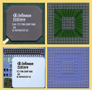 傳統(tǒng)的外綁器件的另一常見問題在于封裝的大小。仿真設(shè)備被特別設(shè)計成與標準的生產(chǎn)器件占位面積相符合,并且擁有一組額外添加的針腳來提供更多的信號。同時,還給封裝直接添加了一個頂端連接,通過可移動的連接器就可以采集相同的信號,下方圖象分別顯示了大規(guī)模生產(chǎn)器件封裝(頂端)及仿真設(shè)備封裝(底端)。
