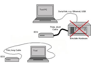 連接仿真系統(tǒng)時的首要問題在于連接長度受到限制,因為系統(tǒng)時鐘的速度過高。例如,如果使用一個頻率為150MHz的微控制器,那么,50cm長的連接線造成的傳輸時間延遲大約為2.0ns,但是時鐘周期僅為6.67ns,所以2.0ns的單向延誤時間是相當巨大的。由于在這些高頻率器件中,連接線扮演著傳輸線的角色,并且它們的終接阻抗是無法得到保障的,因此,這看似短暫的時間幾乎妨礙了任何遠離目標器件的控制功能。在這個例子中,想要忽略傳輸線造成的時間上的延遲,線路的最大長度不能超過16cm。所以,在線仿真器(ICE)具有與被測發(fā)動機電控單(ECU)相同的環(huán)境需求。