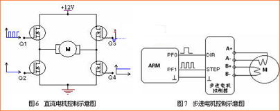對執(zhí)行機構(gòu)的輸出控制包括對EPS直流電機和減振器步進電機的控制。直流電機控制可分為勵磁控制和電樞控制兩種方法。這里采用開關(guān)控制方式驅(qū)動功率場效應(yīng)晶體管,通過脈沖寬度調(diào)制PWM控制電樞電壓實現(xiàn)轉(zhuǎn)速控制。圖6所示為直流電機控制示意圖[7],定義ARM的端口PE3、PE4、PE5、PE6輸出直流電機控制信號,經(jīng)過四個驅(qū)動光耦分別加到四個MOS開關(guān)管Q1、Q2、Q3、Q4控制端。當(dāng)要求電機正轉(zhuǎn)時,Q1受PWM 信號控制,同時Q4被施加高電平導(dǎo)通,Q2、Q3被施加低電平截止;當(dāng)要求電機反轉(zhuǎn)時,Q3受PWM信號控制,Q2被導(dǎo)通,Q1、Q4被截止,方便實現(xiàn)了電機的方向控制和轉(zhuǎn)速控制。