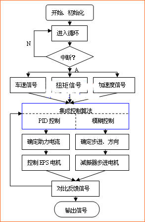 車輛正常行駛時,傳感器采集控制系統(tǒng)外部的車身垂直振動加速度、轉(zhuǎn)向軸轉(zhuǎn)矩、車速等狀態(tài)信號,經(jīng)調(diào)理傳送到控制器的電控單元ECU,ECU進行分析計算處理,產(chǎn)生控制信號傳輸給執(zhí)行機構(gòu),執(zhí)行機構(gòu)按控制要求驅(qū)動懸架減振器的步進電機和轉(zhuǎn)向系的直流電機,改變減振器的阻尼,同時提供轉(zhuǎn)向助力,實現(xiàn)ASS和 EPS的協(xié)調(diào)集成控制。