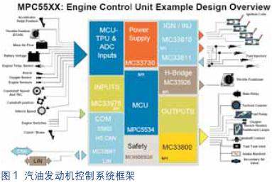 以典型的汽油發(fā)動(dòng)機(jī)控制系統(tǒng)為例,飛思卡爾的參考設(shè)計(jì)系統(tǒng)框架如圖1。