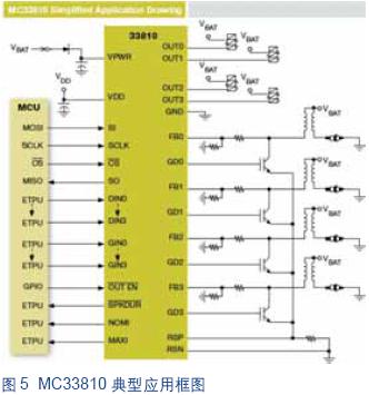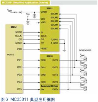 在發(fā)動(dòng)機(jī)控制應(yīng)用中,MC33811提供的診斷功能可以及時(shí)匯報(bào)噴油器故障,以防止損壞發(fā)動(dòng)機(jī)。同時(shí)還可以用于其他需要診斷電磁閥的應(yīng)用中,如變速箱控制器或電磁氣門控制器。