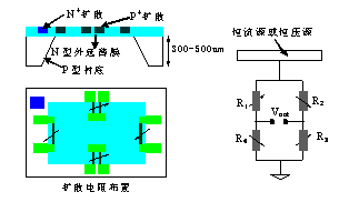 利用壓阻效應(yīng)原理,采用集成工藝技術(shù)經(jīng)過摻雜、擴(kuò)散,沿單晶硅片上的特定晶向,制成應(yīng)變電阻,構(gòu)成惠斯通電橋,利用硅材料的彈性力學(xué)特性,在同一硅材料上進(jìn)行各向異性微加工,就制成了一個集力敏與力電轉(zhuǎn)換檢測于一體的擴(kuò)散硅傳感器,如圖1所示。