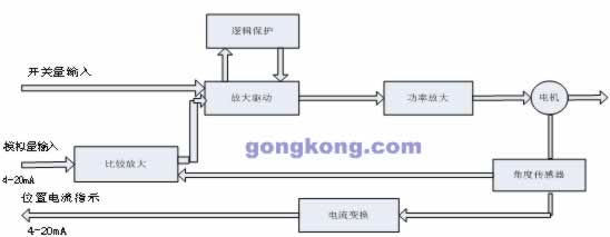電動執(zhí)行機(jī)構(gòu)是工業(yè)過程測量和控制系統(tǒng)的終端控制裝置,能夠?qū)CS系統(tǒng)的控制信號(模擬量信號0/4-20MA或開關(guān)量信號DC24V、AC220V)轉(zhuǎn)換成輸出件位移(角位移、多回轉(zhuǎn)角位移或線位移)輸出轉(zhuǎn)矩或力以控制閥門內(nèi)截流件的位置或其它調(diào)節(jié)機(jī)構(gòu),使被控介質(zhì)按系統(tǒng)規(guī)定的狀態(tài)工作,以此達(dá)到被調(diào)參數(shù)(溫度、壓力、流量、物位等)實現(xiàn)自動或手動調(diào)節(jié)的目的。電動執(zhí)行機(jī)構(gòu)是一個具有深度負(fù)反饋的隨動系統(tǒng),其本身具有伺服放大器。電動機(jī)的旋轉(zhuǎn)經(jīng)減速器減速變?yōu)闇p速器輸出軸的轉(zhuǎn)動,此輸出軸轉(zhuǎn)角θ作為整個電動執(zhí)行機(jī)構(gòu)的輸出量。當(dāng)電動機(jī)正向轉(zhuǎn)動時,θ角不斷增長,同時由位置變送器發(fā)出與θ成比例的位置反饋電流If,If也隨θ而不斷增大,指令信號II與If之差值隨之減小,當(dāng)此差值小于伺服放大器的死區(qū)△E(定在0.16mA左右比較合適,太小易造成機(jī)構(gòu)振蕩,電機(jī)發(fā)熱)時,電動機(jī)斷電,停止轉(zhuǎn)動,輸出軸將停在相應(yīng)的位置,系統(tǒng)處于新的平衡。當(dāng)指令信號II減小時,伺服放大器輸出帶動電機(jī)產(chǎn)生相應(yīng)的反向轉(zhuǎn)動,最終達(dá)到另一平衡。