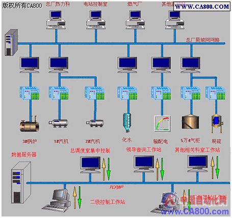 根據(jù)實際控制設(shè)備實際分布,設(shè)立6個監(jiān)控點,鍋爐監(jiān)控點設(shè)工程師站一個及一般監(jiān)控站一個,其余監(jiān)控點只設(shè)一臺上位,以上位機為核心組成一個計算機數(shù)據(jù)采集監(jiān)控系統(tǒng),通過下位機實現(xiàn)數(shù)據(jù)的采集,它對測量數(shù)據(jù)的處理以及控制算法都是以數(shù)字計算為基礎(chǔ),通過軟件實現(xiàn)。硬件由上位機﹑下位機、一次儀表﹑及執(zhí)行器等部件組成。