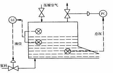 系統(tǒng)開始運(yùn)行后,有漿泵負(fù)責(zé)把紙漿從紙漿池中打入到流漿箱,內(nèi)其漿位與出口壓力通過變送器檢測送入控制設(shè)備,在與設(shè)定值比較后形成控制偏差,通過設(shè)計(jì)合適的控制算法,產(chǎn)生控制輸出,分別控制漿泵的打漿速度與風(fēng)機(jī)的出口空氣流量,以保證流漿箱內(nèi)的漿位與出口壓力穩(wěn)定,進(jìn)而控制噴漿速度與流量,使噴出的紙漿厚薄均勻,從而保證成品紙的質(zhì)量。其工藝過程控制如圖1所示。此控制過程一共有兩個(gè)閉環(huán)回路一個(gè)是液位,一個(gè)是總壓。本系統(tǒng)通過調(diào)節(jié)氣墊空氣量控制總壓,調(diào)節(jié)進(jìn)漿量控制漿位。