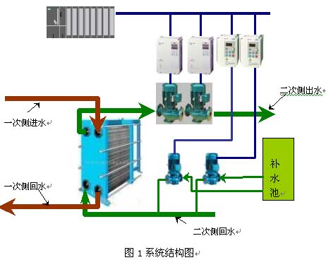 2 系統(tǒng)控制目標(biāo) 每個換熱站主要由兩臺換熱器組成的換熱系統(tǒng)、兩臺循環(huán)水泵組成的循環(huán)水系統(tǒng)和兩臺補水泵組成的補水系統(tǒng)來構(gòu)成。每臺循環(huán)泵采用一臺愛默生TD2000變頻器控制,每臺補水泵采用一臺愛默生TD900變頻器控制??删幊炭刂破鳎⊿iemens S7-300)采集變頻器的狀態(tài)數(shù)據(jù)并給出控制信號,構(gòu)成現(xiàn)地測控系統(tǒng)。系統(tǒng)結(jié)構(gòu)及流程圖如圖1。