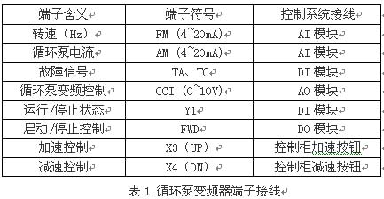 3 控制系統(tǒng)設(shè)計 3.1 循環(huán)泵控制方案 愛默生TD2000變頻器用于循環(huán)泵的控制,TD2000系列通用變頻器是艾默生網(wǎng)絡(luò)能源有限公司自主開發(fā)生產(chǎn)的高品質(zhì)、多功能、低噪音的通用型變頻器,采用的先進控制算法如下: l 優(yōu)化空間電壓矢量PWM調(diào)制 l V/F控制方式,線性和平方和V/F曲線 l 高精度、高分辨率頻率設(shè)定 l 自動轉(zhuǎn)矩補償,手動轉(zhuǎn)矩提升 l 內(nèi)置PLC編程多速運行;外接端子控制多速運行 l 內(nèi)置PI閉環(huán)控制 l 停電再啟動 l 根據(jù)負載情況,自動改變V/F曲線,實現(xiàn)節(jié)能運行 l 自動電壓調(diào)整(AVR),能自動適當(dāng)?shù)馗淖兓绢l率,保證電機的負載能力 l 運轉(zhuǎn)命令給定方式3種,頻率設(shè)定方式4種 l 四位數(shù)碼,中英文液晶顯示 循環(huán)泵控制變頻器端子接線如表1所示(以一臺TD2000為例):