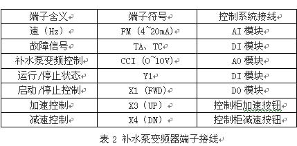 3.2補水泵控制變頻器端子接線如表2所示(以一臺TD900為例):
