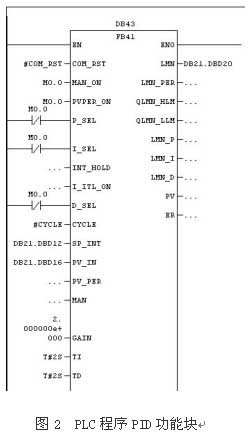 變頻器補水泵系統(tǒng)進行恒壓控制,以二次側(cè)回水壓力為控制目標(biāo)。當(dāng)回水壓力低于壓力下限時即自動啟動補水,以防止循環(huán)泵長時間過載運行燒壞,或者管道內(nèi)壓力太小造成管道破裂;在換熱系統(tǒng)啟動前,亦可以手動啟動補水泵變頻器,使管道內(nèi)水壓力滿足系統(tǒng)啟動條件。PLC程序中PID功能塊參數(shù)如圖2.