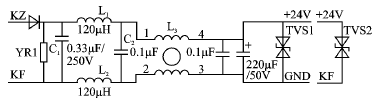 圖5中,KZ、KF外接24 V直流電源;YR1為壓敏電阻器,VmA=1.5×24 = 36 V,用于抗浪涌沖擊;L1、L2、C1和C2構成平衡型LC濾波器,抑制差模干擾;L3為共模電感,用于抑制共模干擾;TVS1用于抑制電快速瞬變脈沖群干擾。注意,如果GND不能通過機殼接地,則必須要加TVS2接KF,目的是把瞬變脈沖干擾信號“導”向大地。