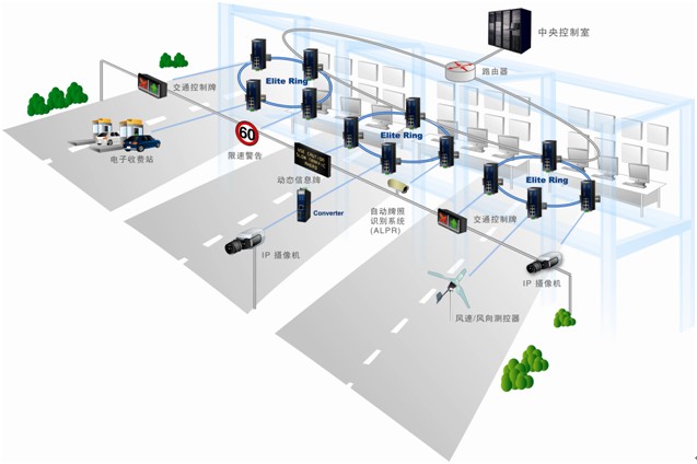 工業(yè)以太網(wǎng)的穩(wěn)定和持續(xù)工作能力可以通過(guò)SUNIX ELITE Ring 技術(shù)來(lái)解決,其網(wǎng)絡(luò)故障恢復(fù)時(shí)間 <10ms, 在使用SUNIX 的ESW-08062-SSC 管理型交換機(jī)時(shí),其設(shè)計(jì)有總共28個(gè)次級(jí)控制面板,每個(gè)控制面板擁有4條冗余環(huán)路。這些控制面板被沿途安置在整個(gè)高速路上并且互相連接,最后通過(guò)導(dǎo)軌技術(shù)連接到核心路由器上。光纖到以太網(wǎng)通訊轉(zhuǎn)換器此處被用來(lái)作為連接 DI & DV 設(shè)備使用。