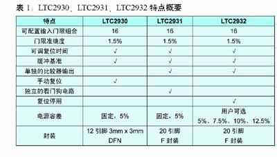 這三款器件的整體架構(gòu)和操作規(guī)格很相似,但各具一些獨(dú)特的特征 (見(jiàn)表1)。LTC2930將在任何欠壓過(guò)程之后或當(dāng)手動(dòng)復(fù)位輸入 ( /MR ) 被拉至低電平時(shí)生成一個(gè)復(fù)位信號(hào)。由于它采用了緊湊型3mm x 3mm 12引腳DFN封裝,因而適合于空間受限型應(yīng)用。LTC2931包括一個(gè)看門狗輸入 (WDI)、一個(gè)看門狗輸出 ( /WDO ) 和可以由用戶調(diào)節(jié)的看門狗周期,旨在實(shí)現(xiàn)微處理器監(jiān)視和控制。LTC2932能夠改變其監(jiān)視器門限 (從5% 至12.5%),并由一個(gè)復(fù)位停用引腳提供了裕度調(diào)節(jié)能力。LTC2931和LTC2932均采用20引腳TSSOP封裝,并具有分離的比較器輸出,從而實(shí)現(xiàn)了單獨(dú)的電源監(jiān)視和/或排序。