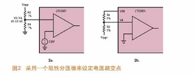 實(shí)際門限由集成精準(zhǔn)分壓器來(lái)設(shè)定,用于5V、3.3V、3V、2.5V、1.8V和1.5V電源監(jiān)視。對(duì)于其他的電源電壓值,具0.5V門限的獨(dú)立比較器允許使用一個(gè)阻性分壓器來(lái)對(duì)幾乎任何正電源進(jìn)行監(jiān)視,如圖2a所示。V4輸入還采用用于偏移的集成緩沖基準(zhǔn)來(lái)監(jiān)視負(fù)電壓,并提供了相同的1.5%準(zhǔn)確度,見(jiàn)圖2b。
