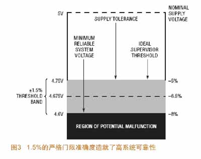假設(shè)一個(gè)具 ±5% 電源容差的5V系統(tǒng),5V電源可以在4.75V至5.25V之間變化。由該電源供電的系統(tǒng)IC必須在此電壓范圍之內(nèi)(以及略超出該范圍的電壓條件下,正如下文說(shuō)明的) 可靠地運(yùn)作。如果一個(gè)用于該電源的監(jiān)控器具有完美的準(zhǔn)確度,那么它將精確地在4.75V電壓條件下產(chǎn)生一個(gè)復(fù)位信號(hào)。然而,如此理想的監(jiān)控器并不存在。監(jiān)控器的實(shí)際復(fù)位門限會(huì)在一個(gè)規(guī)定的范圍內(nèi)波動(dòng);在整個(gè)溫度范圍內(nèi),LTC2930、LTC2931和LTC2932的復(fù)位門限將在其標(biāo)稱門限電壓的 ±1.5% 以內(nèi)變化 (圖3)。復(fù)位門限范圍和電源容差范圍兩者不應(yīng)重疊。這可以防止當(dāng)電源實(shí)際上處于其規(guī)定容差范圍之內(nèi)時(shí)發(fā)生錯(cuò)誤或麻煩的復(fù)位。