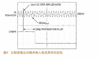 圖4示出了針對(duì)LTC2931上一個(gè)"噪聲"輸入的COMP5比較器輸出響應(yīng)。在該示例中,一個(gè)以500mV為中心的500kHz、100mVP-P正弦波被加至V5輸入。即使該信號(hào)幅度走低至450mV,COMP5仍將保持高電平。接著,輸入的DC電平下降2mV。作為響應(yīng),COMP5將被拉至低電平,并保持低電平。如前文所述,只有那些具有足夠長(zhǎng)的持續(xù)時(shí)間和足夠量級(jí)的瞬變才會(huì)觸發(fā)比較器輸出被拉至高電平或低電平。