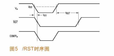 三款監(jiān)控器均包括一個(gè)可調(diào)復(fù)位超時(shí)周期tRST。當(dāng)所有輸入都高于其門限值時(shí),復(fù)位定時(shí)器即被起動(dòng) (圖5)。在tRST期間,/RST處于低電平,而且,只要瞬變之間的時(shí)間小于復(fù)位超時(shí)周期,/RST都將保持低電平。換句話說(shuō),復(fù)位超時(shí)可以防止那些頻率高于1/tRST的電源瞬變?cè)?/RST 輸出上引發(fā)不希望的電平變換。在這些電源瞬變期間把 /RST保持于低電平將抑制虛假?gòu)?fù)位的發(fā)生。