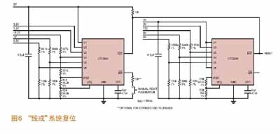 LTC2930、LTC2931和LTC2932上的 /RST 輸出是開(kāi)路漏極,并包含至V2電壓的弱上拉電流源。這種開(kāi)路漏極結(jié)構(gòu)提供了許多優(yōu)點(diǎn)。例如:這些輸出均可以采用一個(gè)上拉電阻器在外部上拉至高于V2的電壓。這便于使用多個(gè)工作于不同I/O電壓的器件。此外,還可以把多個(gè)開(kāi)路漏極輸出配置成一種"線或"格式 (在該格式中,輸出是連接在一起的)。圖6示出了兩個(gè)LTC2930監(jiān)控器,它們的開(kāi)路漏極 /RST 輸出連接在一起,并利用一個(gè)10k上拉電阻器上拉至5V。如果一個(gè) /RST 輸出由于某個(gè)復(fù)位過(guò)程而被拉至低電平,則它將吸收電流,并把另一個(gè)輸出拉至低電平。